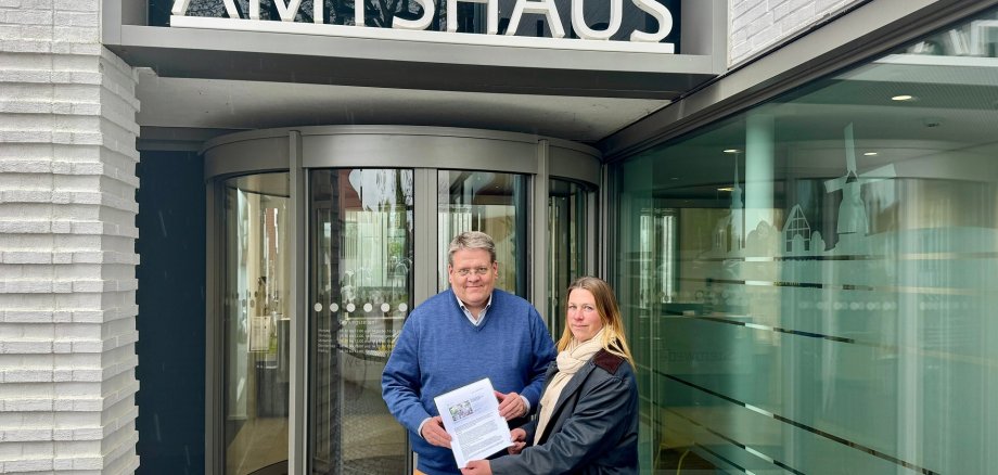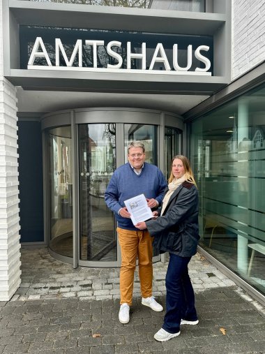 Foto: Sarah Stücker vom Waldfrieden Kultur e.V., dem Organisator des Festivals, überreicht Bürgermeister Kai Abruszat eine Petition zur Rettung des Festivals.