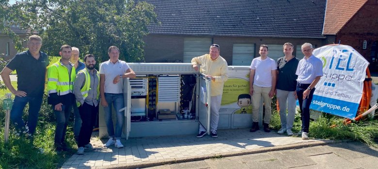Bürgermeister Kai Abruszat ließ sich von Projektleiter Bergmann auch noch den zentralen Verteilerkasten in Westrup zeigen, von dem aus das Lichtsignal in alle Stemweder Ortsteile weitergeleitet wird. Bergmann erklärte, dass nach Wehdem und Westrup als nächstes Haushalte in Oppendorf und Oppenwehe aufgeschaltet würden und im Anschluss dann die Ortsteile Haldem, Destel und Twiehausen dazu kämen. Auf die Frage von Bürgermeister Kai Abruszat, wann denn tatsächlich alle gustav-Kundinnen und Kunden in Stemwede angeschlossen seien, antworteten die Projektverantwortlichen: „Im Sommer 2025.“